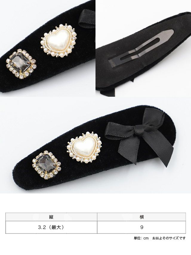 トレンド感バツグンなベロアヘアピン。リボンやハート、キラキラのビジューがキュートさをより際立たせてくれる。