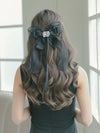 ふわふわ可愛いシフォンがレイヤードされたガーリーなリボンバレッタ。真ん中にはアクセントになるパールとビジューが装飾され、、一気に高級感UP。