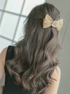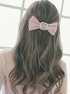 中央にバックルのパールを豪華に飾った女の子らしいリボンバレッタ。重ね合わさったダブルリボンでガーリーに可愛く、ボリューム感もあってオススメ。