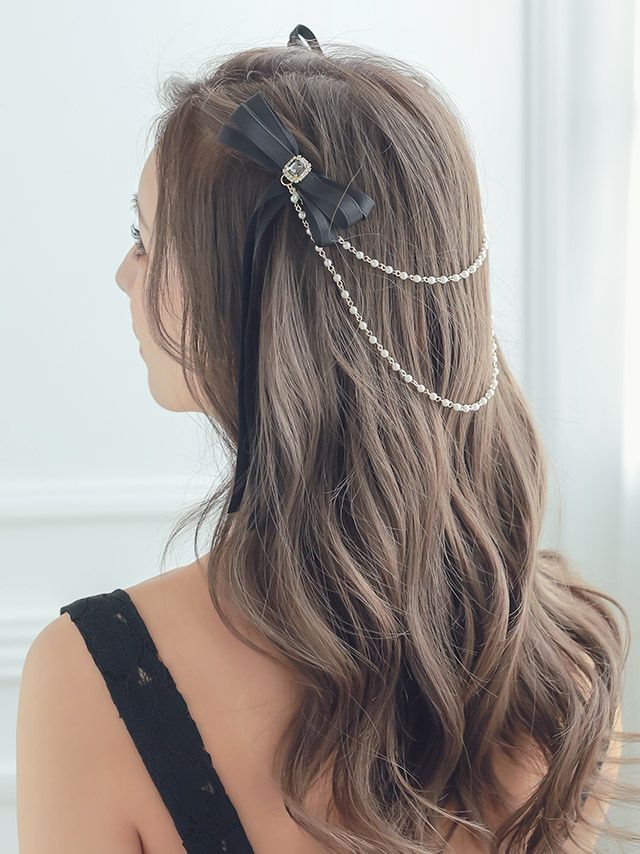 ツインに最適なリボンバレッタ。パールチェーンの垂れ感と揺れが、さらにヘアアレンジを可愛くアップデート。