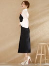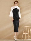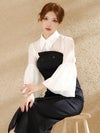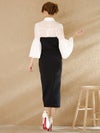 個性的なおしゃれ感漂う上品なセットアップドレス。襟付き&ベルスリーブの気品感のあるブラウスに、トレンチ風のベアワンピースでエレガントに仕上がる。
