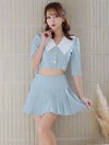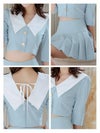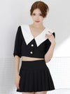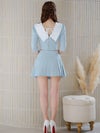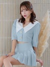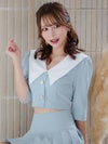 ビッグカラーが華やかに印象にしてくれるセットアップドレス。ゴールドボタンが輝くショート丈のトップスは、ウエストをチラッと見せて色っぽさをプラス。