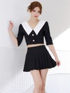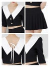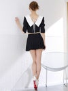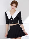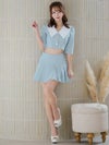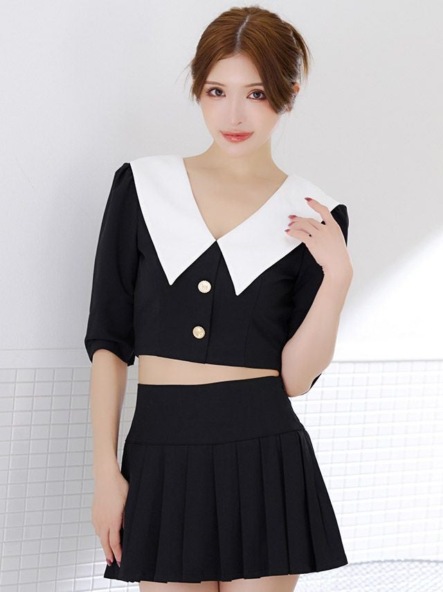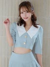 ビッグカラーが華やかに印象にしてくれるセットアップドレス。ゴールドボタンが輝くショート丈のトップスは、ウエストをチラッと見せて色っぽさをプラス。