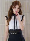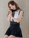 気品漂うレーストップスと、可憐な姿に導いてくれるプリーツスカートのトレンド感溢れるセットアップドレス。ネックリボンが可愛らしさをプラス。