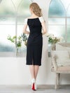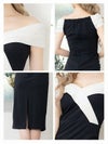 シンプルデザインに映えるバイカラーのオフショルダーが、デコルテを美しく魅せる膝丈ドレス。大人女性の美しさを高めてくれる一着。
