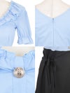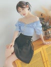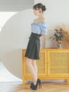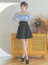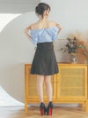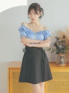 3. [韓国ドレス] ゴールドボタン フリル オフショル ウエスト切替 リボン スカート フレアミニドレス