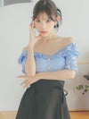 [韓国ドレス] ゴールドボタン フリル オフショル ウエスト切替 リボン スカート フレアミニドレス