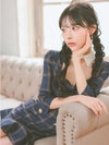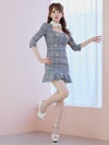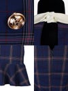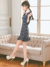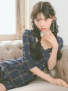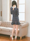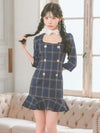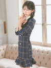 - チェック柄スクエアネック袖あり襟デザインタイトミニドレス