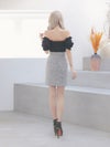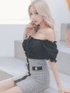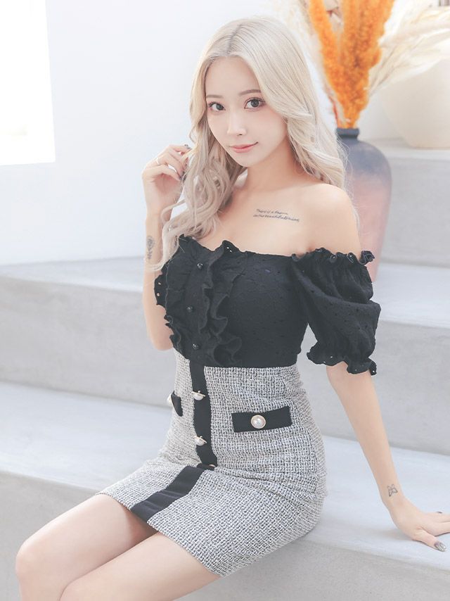 - [韓国ドレス] オフショルダーフリルパフスリーブ切替モノトーンツイードタイトミニドレス