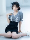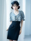 - [韓国ドレス] 襟つき半袖フリルパフスリーブギンガムチェックウエスト切替タイトミニドレス
