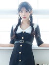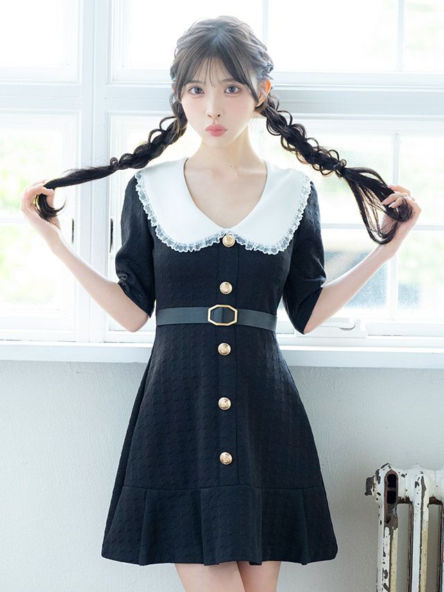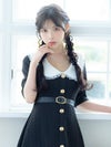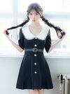 - [韓国ドレス] フリル襟デザインベルト付きゴールドボタン半袖フレアミニドレス