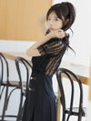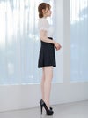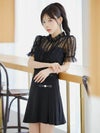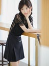 - [韓国ドレス] モノトーンウエスト切替レースデザイン半袖フレアミニドレス