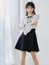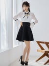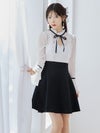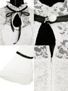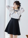 - [韓国ドレス] レース胸あきネックリボン長袖パフスリーブハイウエスト切替フレアミニドレス