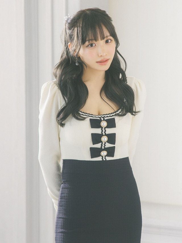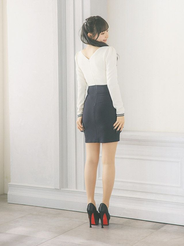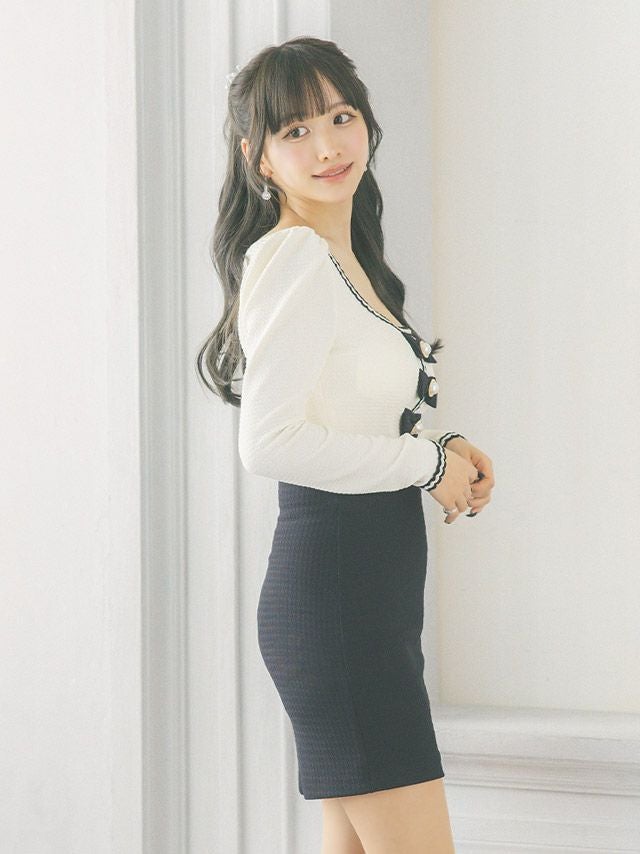 [韓国ドレス] Uネックパールリボンデザイン長袖モノトーンストレッチタイトミニドレス