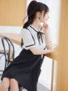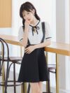 4. [韓国ドレス] サロペ風モノトーン半袖ネックリボンフレアミニドレス