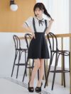 [韓国ドレス] サロペ風モノトーン半袖ネックリボンフレアミニドレス