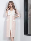オトナのかわいさを演出する、上質な膝丈ワンピース。胸元のリボンで視線を集めて、さりげない谷間魅せも。