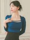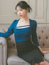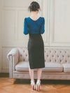 - [韓国ドレス] カシュクールウエスト切替スクエアネックロープデザイン七分袖スリット入りタイトミニドレス