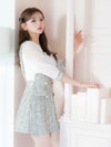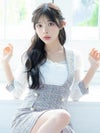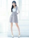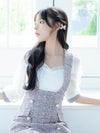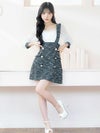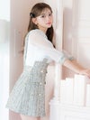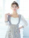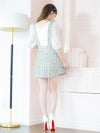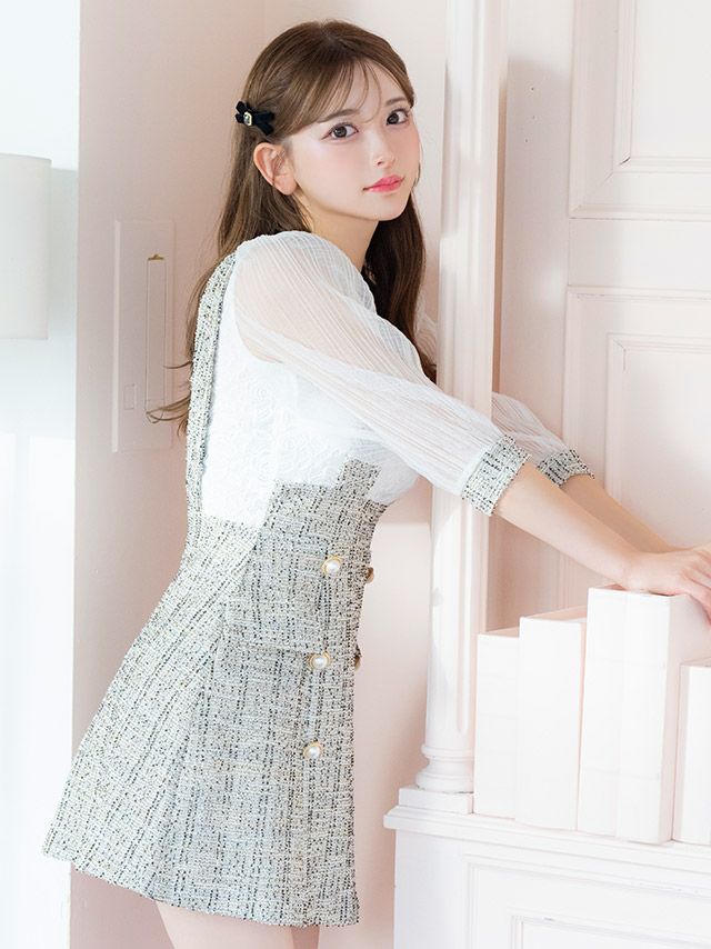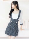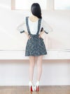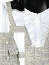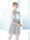 - パフスリーブ サロペット ツイード 袖あり ハイウエスト切替 フレアミニドレス