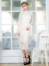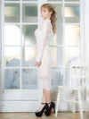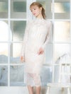 エレガントで高級感溢れる総レースドレス。落ち着きのある膝丈とフリルネックが上品な印象をしながら、スリットで色気もプラスしてくれる。