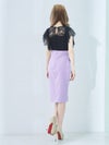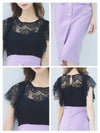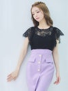 シンプルで大人っぽいモードな感じのひざ丈ドレス。袖の部分がフリンジレースデザインで、程よい透け感が大人セクシー。