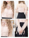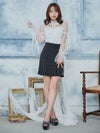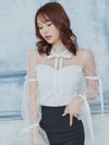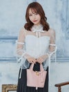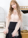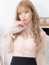 ブラウス×プリーツスカートのセットアップデザイン。フリルネックのリボンと袖部分のリボンと、透け感のあるレース素材がガーリー感たっぷり。