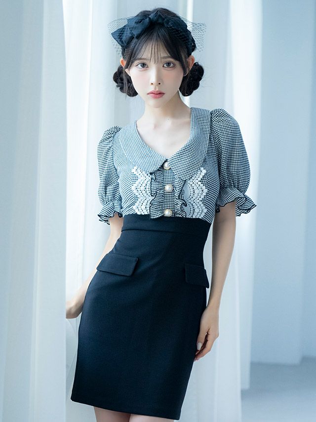 - [韓国ドレス] 襟つき半袖フリルパフスリーブギンガムチェックウエスト切替タイトミニドレス