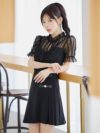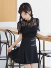 #緩苺 #ガーリーワンピ #ウエスト切替 #モノトーン #フレアドレス #二の腕カバー #半袖 #ウエストカバー #美脚魅せ #ブラック