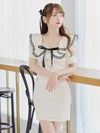 リボンとフリルが甘くモノトーンで上品なミニワンピ。大きめフリルデザインで、小顔効果もバツグン。