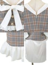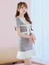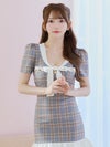 3. [韓国ドレス] チェック柄パイピング半袖パフスリーブネックリボンウエストマーク裾フリルマーメイドミニドレス