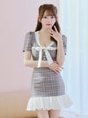 [韓国ドレス] チェック柄パイピング半袖パフスリーブネックリボンウエストマーク裾フリルマーメイドミニドレス