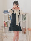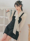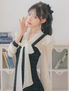 - [韓国ドレス] ボウタイ長袖フリルシフォンドッキングネックリボンフレアミニドレス
