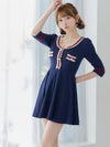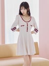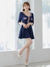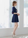 [韓国ドレス] 異素材ラインパフスリーブ袖ありフレアミニドレス