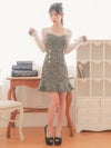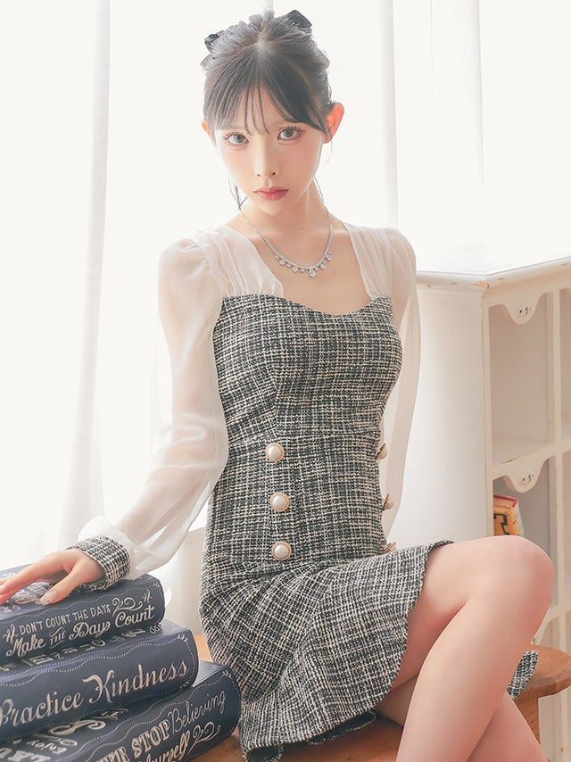 3. [韓国ドレス] シアー長袖ツイード裾フリルタイトミニドレス