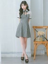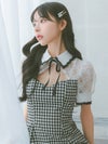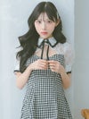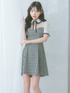 [韓国ドレス] 襟デザインバストカットネックリボンチェック柄半袖フレアミニドレス