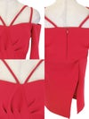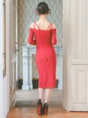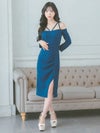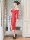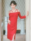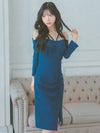 [韓国ドレス] キャミ風コードデザイン七分袖オフショルダースリット入りタイト膝丈ドレス