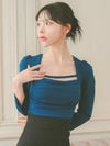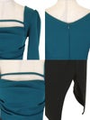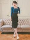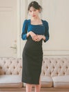 [韓国ドレス] カシュクールウエスト切替スクエアネックロープデザイン七分袖スリット入りタイトミニドレス