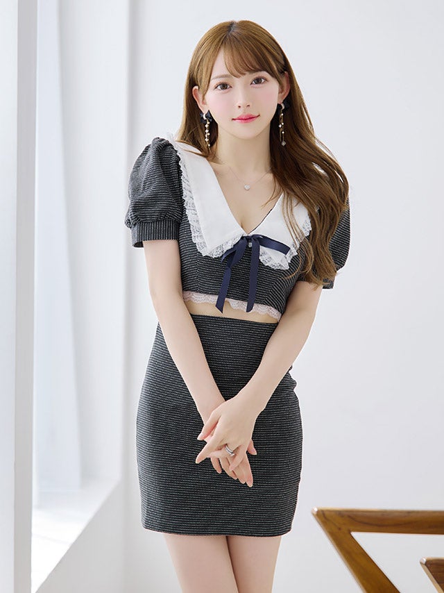[韓国ドレス] 襟デザイン リボン 半袖 パフスリーブ ウエストカット モノトーン ミニドレス
