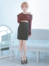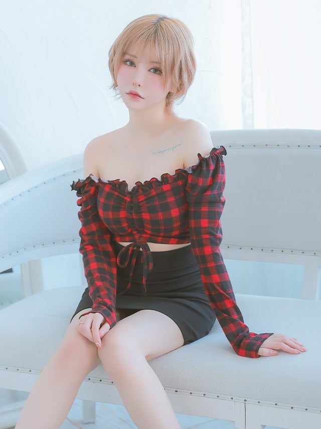 3. [韓国ドレス] オフショルダー長袖バッファローチェックウエストカット切り替えタイトミニドレス