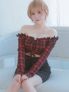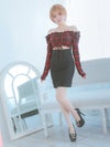 [韓国ドレス] オフショルダー長袖バッファローチェックウエストカット切り替えタイトミニドレス