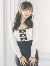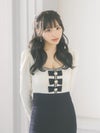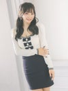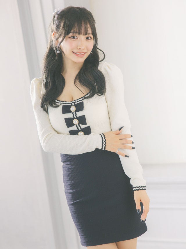 [韓国ドレス] Uネックパールリボンデザイン長袖モノトーンストレッチタイトミニドレス