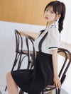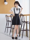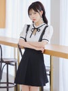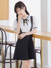 [韓国ドレス] サロペ風 モノトーン 半袖 ネックリボン フレアミニドレス