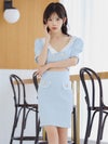 4. [韓国ドレス] ウエストカット 半袖 パフスリーブ ツイード 襟デザイン タイトミニドレス