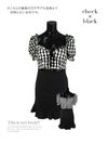 [韓国ドレス] ギンガムチェック柄ウエストカットギャザーパフスリーブミニ半袖ドレス