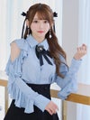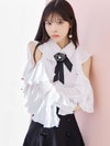 [韓国ドレス] フラワーブローチ付きネックリボン肩あき襟デザインフリル長袖シャツセットアップフレアミニドレス