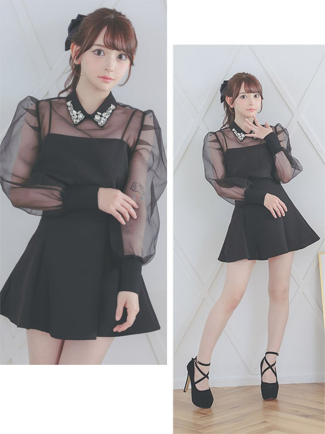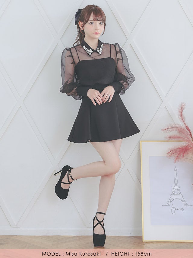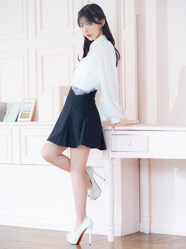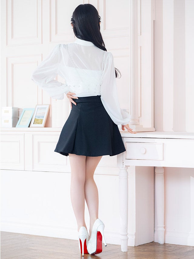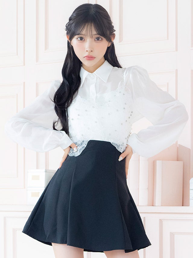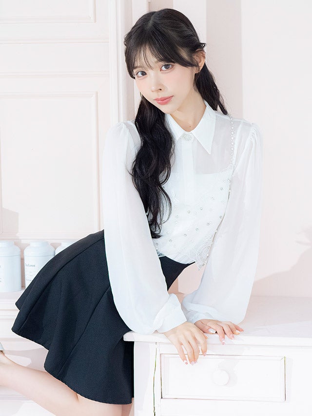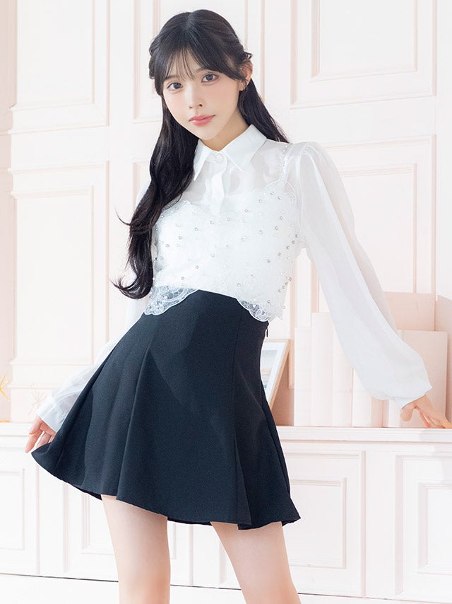 [韓国ドレス] キラキラビスチェ襟つき長袖シアーシャツフレアミニスカートセットアップ