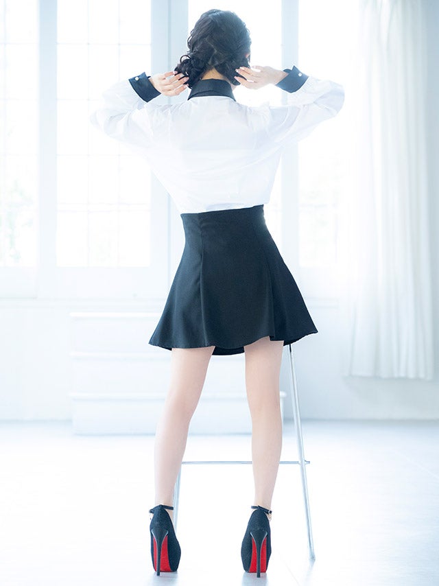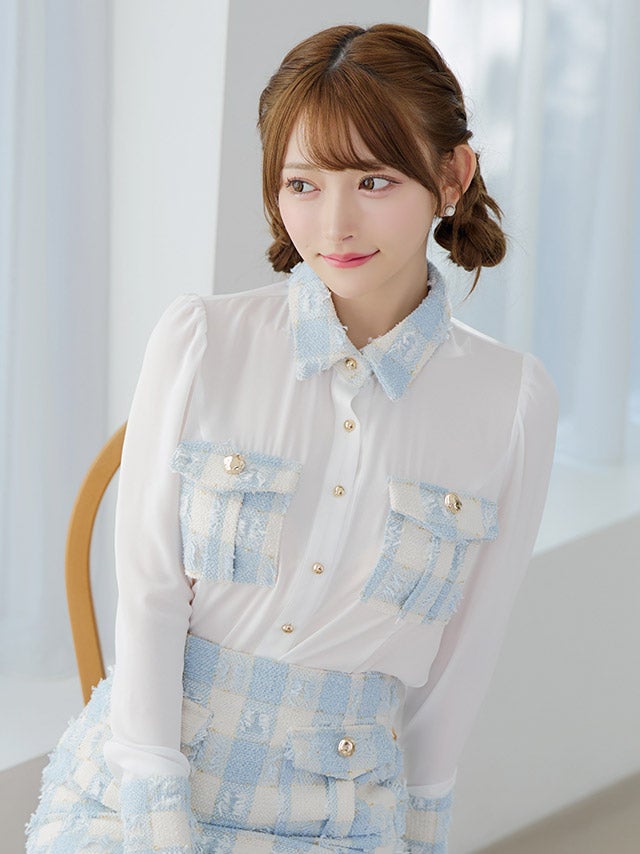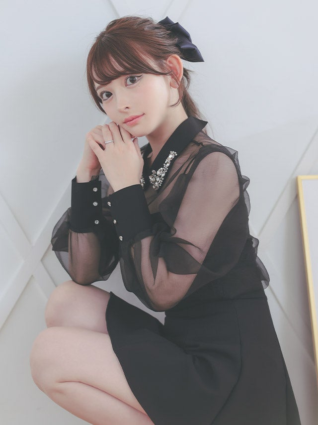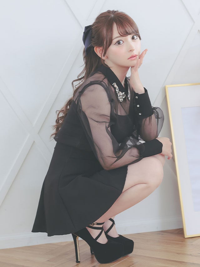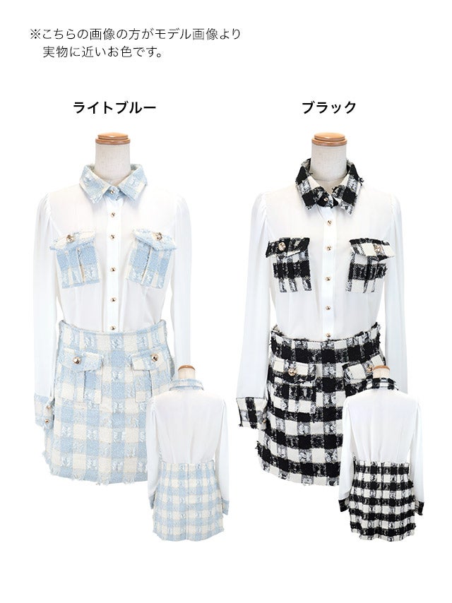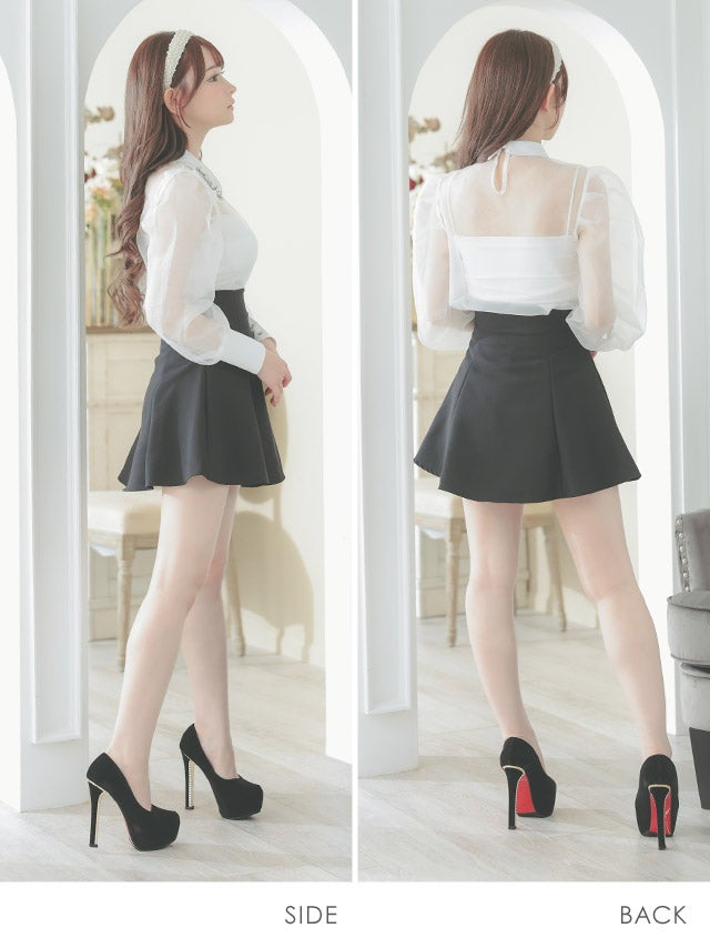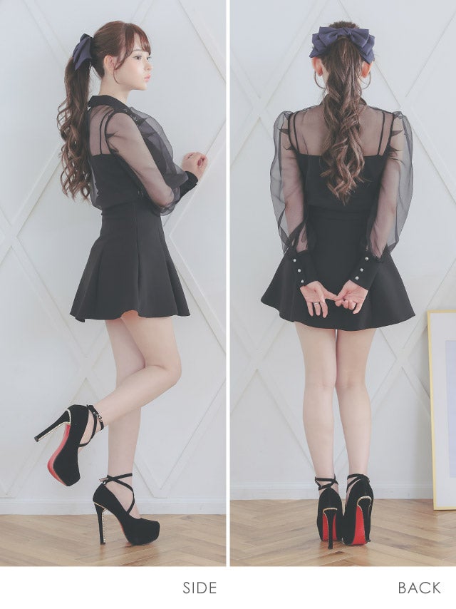 [韓国ドレス] キラキラビスチェ襟つき長袖シアーシャツフレアミニスカートセットアップ