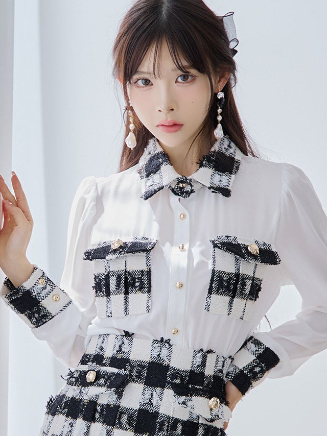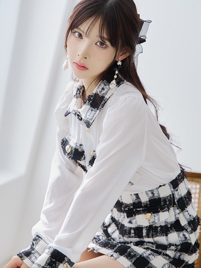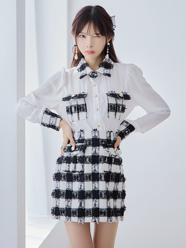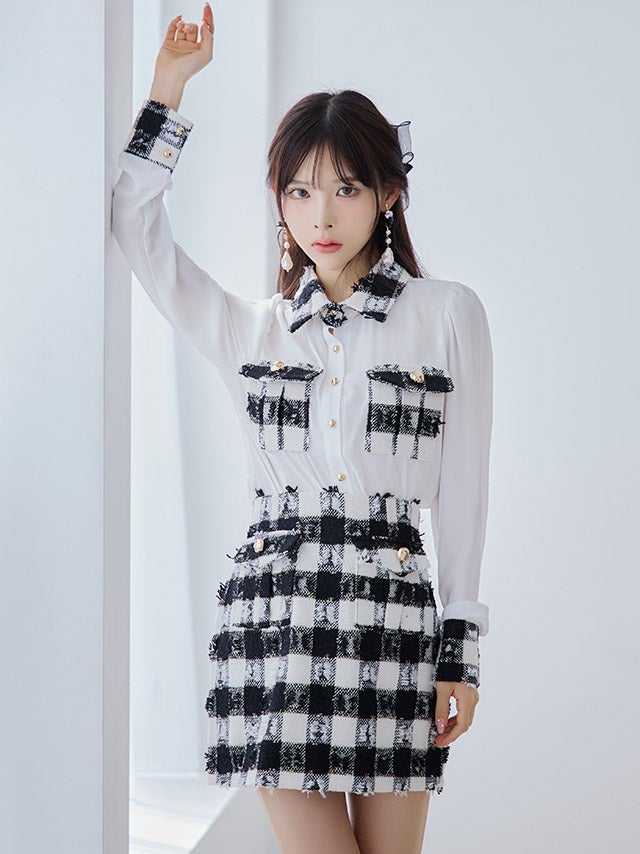 [韓国ドレス] 襟付き長袖シフォンシャツチェック柄セットアップタイトミニドレス