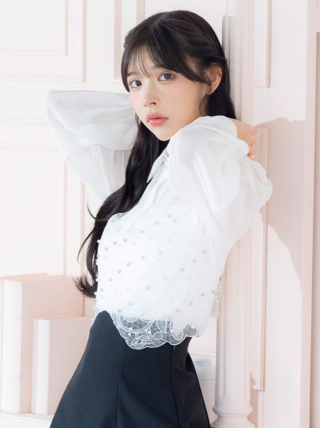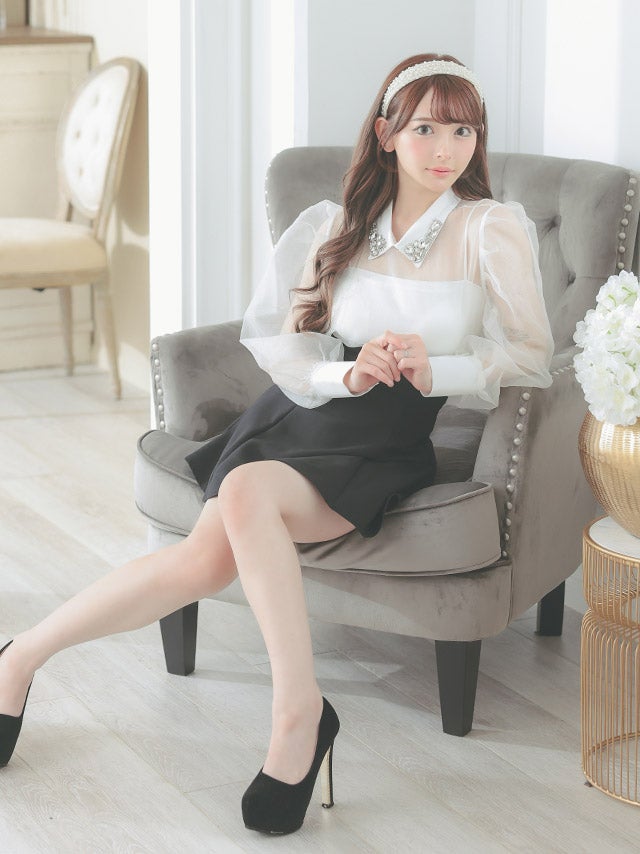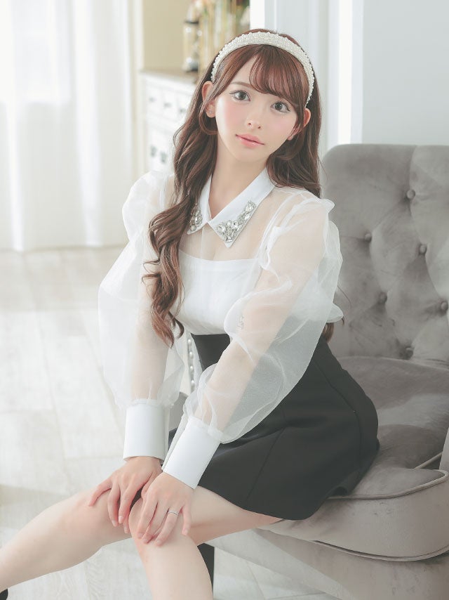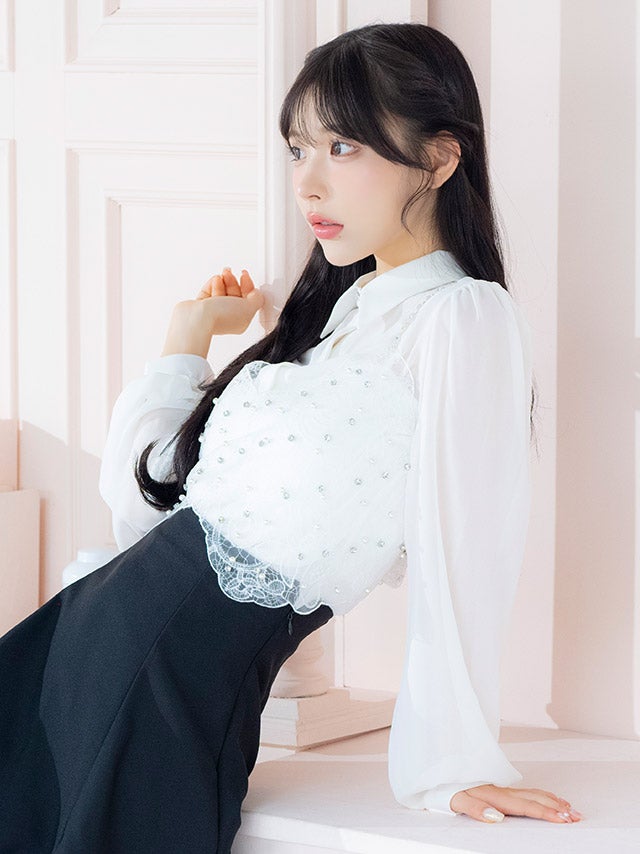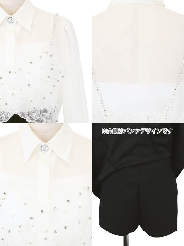 [韓国ドレス] キャミソール付きビジュー襟デザイン長袖シアーブラウス×スカートパンツセットアップドレス