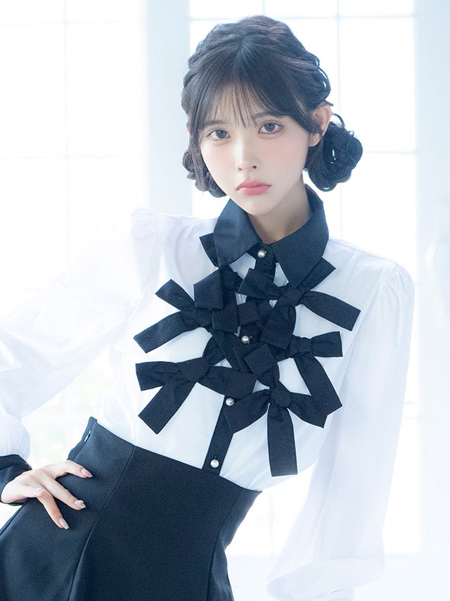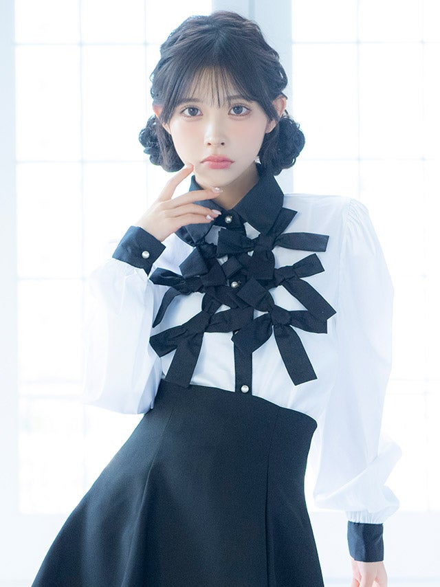 [韓国ドレス] リボンデザイン襟つき長袖モノトーンフレアミニスカートセットアップ